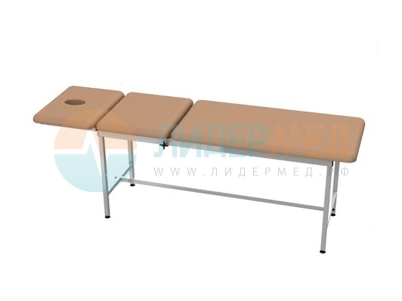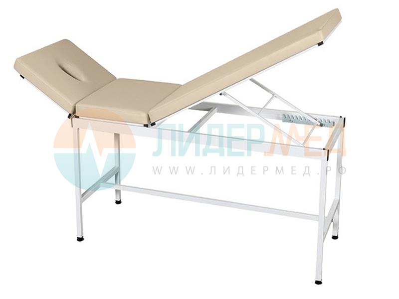 Кушетка состоит из трех секций. Регулируемый подголовник и секция для ног, устанавливается в положение «излом», «домик». Выполнена из высокопрочных материалов. Максимальная нагрузка до 300кг. Ножки стола при стандартной комплектации не оснащены колесами, но имеют возможность их установки.