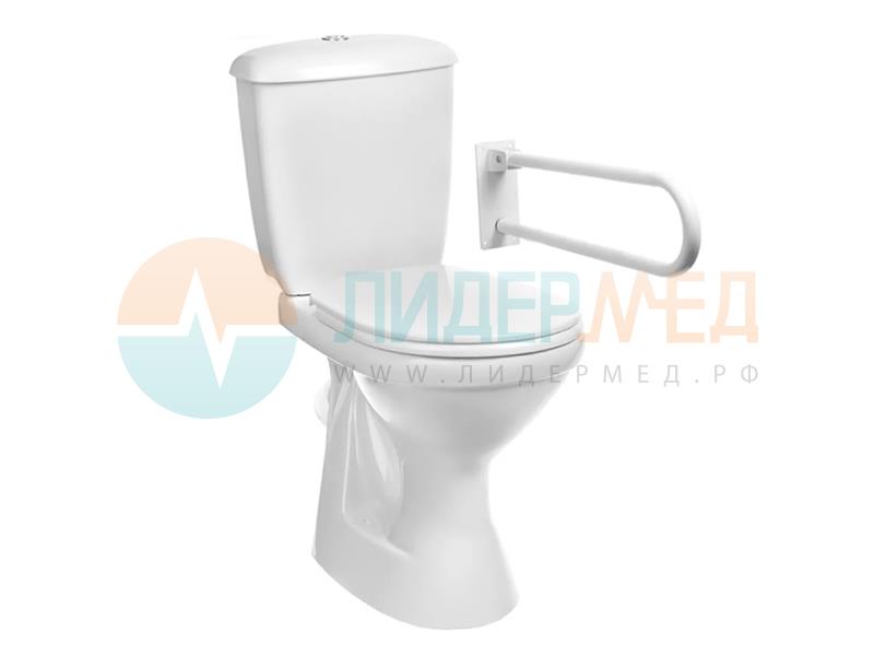 Высокий унитаз, с высотой чаши с сиденьем 47 см для людей с особыми потребностями. С одним белым окрашенным откидным поручнем или с одним откидным поручнем из нержавеющей стали.